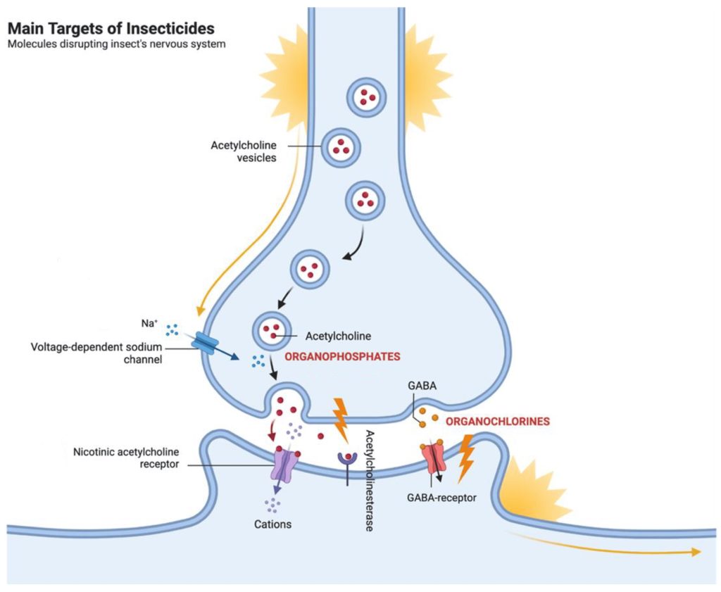 The insecticides bind to the acetylcholinesterase binding site, preventing the breakdown of acetylcholine at the neuromuscular junction.3 This can happen at various levels within the body.4,5,6